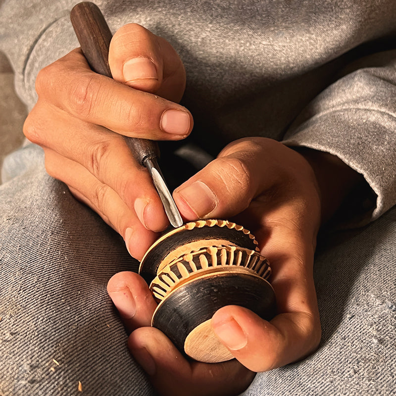 Eduardo, un joven que continúa la tradición familiar de hacer molinillos a mano, nos ayudó a crear un agitador de bola. Aunque al principio le pareció una idea extraña, su disposición y experiencia permitió que este producto vea la luz y hasta se sumara a su propio catálogo.